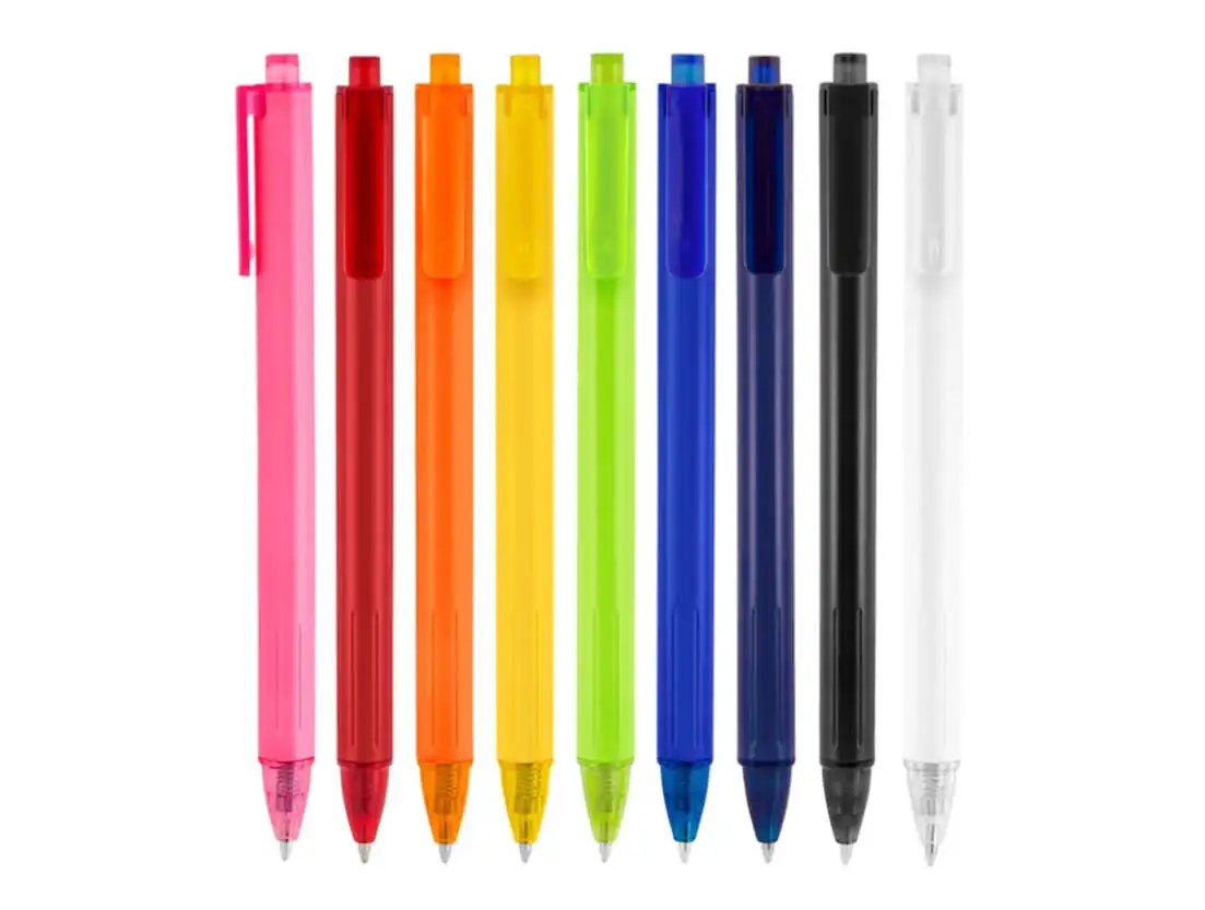 Bolígrafo retráctil. Cuerpo de diferentes colores acabado mate. Pulsador, clip y puntera translucidos del mismo color del cuerpo.