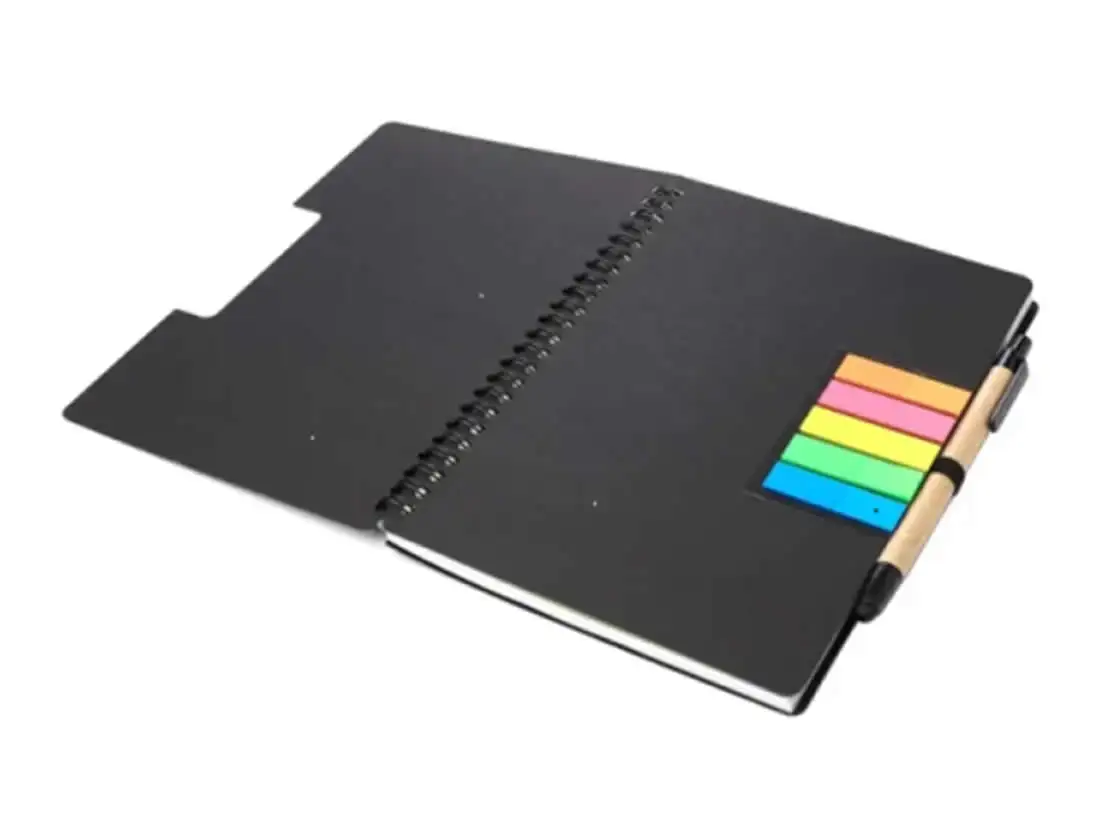 Cuaderno Eco espiralado de material Kraft. 70 hojas de papel obra blanco. Hojas rayadas. Entretapa con 5 colores de post-its. Bolígrafo Ecológico retráctil con puntera touch, incluido en elástico portabolígrafo. Medidas cerrado: 21 cm x 15 cm. Colores: Natural, Negro.
